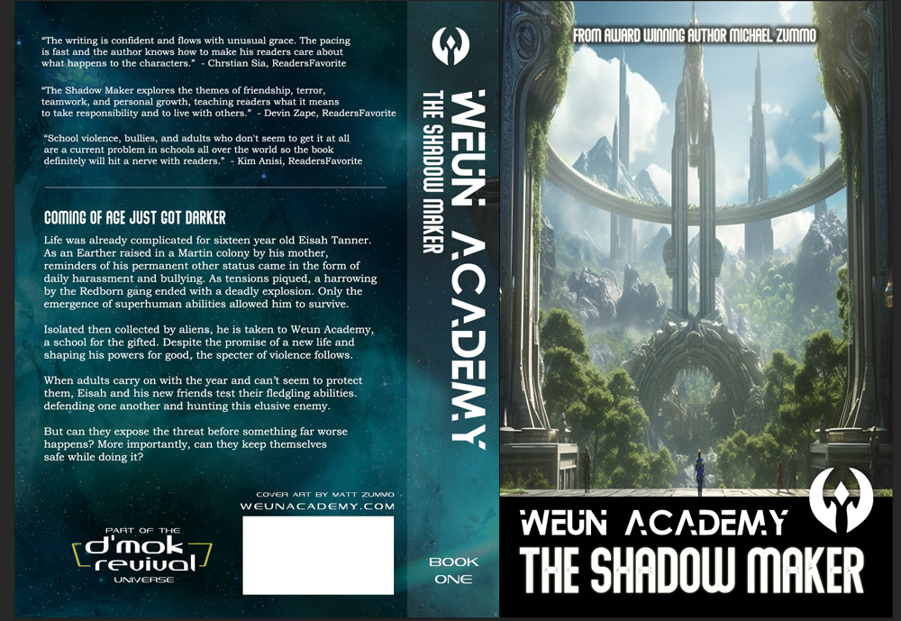 We needed a concept to put on the back covers of my first two spin-off series from D’mok Revival. It had to show it was in the same literary universe without confusing people that it was an edition of the D’mok Revival series! In the end, Matt and I feel it holds true to the original while clearly spelling out what the labeled book is offering: a piece of the D’mok Revival expanded literary universe.